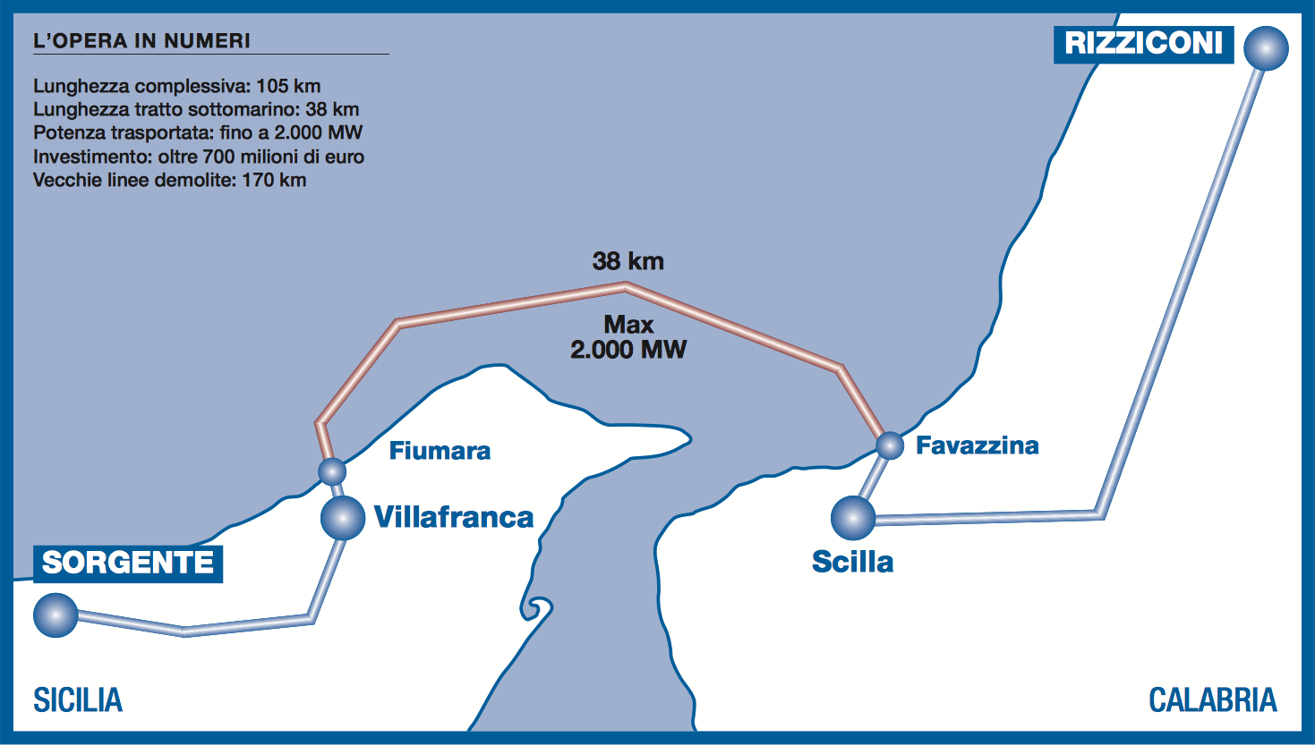 Nelle prossime settimane il Presidente del Consiglio, Matteo Renzi inaugurerà l’elettrodotto “Sorgente-Rizziconi”, realizzato da Terna e che avrà come obiettivo il collegamento dell’energia elettrica tra Sicilia e Calabria.