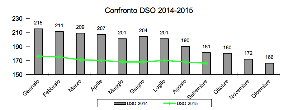 Gli ultimissimi dati del settore dei dispositivi medici mostrano che il DSO a settembre 2015 è stato pari a 166 giorni ridotto di 15 giorni rispetto a settembre 2014 (Figura 1)[9].