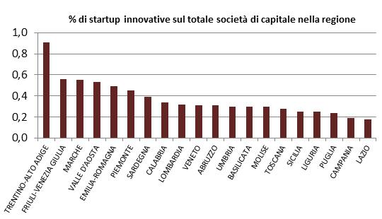 Le startup innovative sono notoriamente progetti che hanno bisogno di essere finanziati tramite capitale di rischio e che in media solo dopo i primi tre anni di vita, durante i quali, peraltro, registrano un elevato tasso di mortalità, restituiscono risultati spendibili sul mercato. Tuttavia sono bacino di talenti e proprio per il contenuto ad alto valore tecnologico e l’ampio ventaglio di incentivi e agevolazioni di natura fiscale a cui possono fare ricorso, costituiscono un volano virtuoso per l’economia nazionale e, in primo luogo, dei territori che le ospitano, soprattutto in un momento in cui la crescita stenta ad accelerare dopo anni di recessione. Il Ministero dello Sviluppo economico mette a disposizione con cadenza trimestrale il report sulle startup innovative, elaborato sui dati del sistema camerale tramite cui è anche possibile tracciare le iscrizioni presso il registro delle imprese, con cadenza mensile e dettaglio territoriale. In chiusura di 2015 è stato pubblicato l’aggiornamento relativo al III trimestre, e a breve saranno disponibili i dati sull’intero anno. A fine settembre 2015 le startup innovative a livello nazionale sono 4.704, in aumento del 10,8% rispetto alla fine del II trimestre, rappresentano lo 0,31% delle società di capitali italiane con un capitale pari complessivamente a circa 236 milioni di euro. La maggior parte di esse opera nel ramo dei servizi alle imprese (72,3%), mentre solo il 18,8% opera nei settori dell’industria in senso stretto. In termini assoluti la maggior parte delle startup innovative è ospitata dalle regioni del Centro – Nord: sono 1.081 in Lombardia, quasi il 22% del totale nazionale, 541 in Emilia Romagna, 455 nel Lazio, 360 in Veneto e 326 in Piemonte. Tra le prime dieci regioni per numero di startup innovative compaiono tra le regioni del Mezzogiorno la Sicilia con 221 startup, pari al 4,7% del totale nazionale; la Puglia con 188 startup innovative, pari al 4% del totale nazionale e la Campania con 273 startup pari al 5,8% del dato italiano. Tra le ultime in classifica sono invece presenti la Basilicata, il Molise e la Valle d’Aosta. Che Puglia, Sicilia e Campania spicchino sul dato del meridionale è indicativo visti i numerosi programmi di sostegno sviluppati nell’ultimo anno a favore delle startup; tra cui anche il programma di tutoraggio e consulenza gestito da Invitalia (Smart&Start Italia) valido sull’intero territorio nazionale, che dedicava un’attenzione particolare alle imprese con sede nel Mezzogiorno e nell’area del terremoto aquilano. Queste tre regioni sembrerebbero dunque essere state caratterizzate da un terreno più fertile allo sviluppo di nuove imprese innovative: che sia stata una risposta alla recessione che proprio su questi territori è stata più profonda, una maggiore efficienza nell’utilizzo delle risorse messe a disposizione anche a livello nazionale o la maggiore capacità di informazione e assistenza fornita alle imprese in fieri da parte delle amministrazioni locali. Un dato più significativo è dato dall’incidenza regionale di startup innovative sul totale delle società di capitali, che aiuta a dare il giusto peso alla dimensione geografica ed economica del territorio di riferimento. La situazione assume infatti in questo caso tinte diverse: è il Trentino – Alto Adige la regione con la più elevata incidenza di startup pari allo 0,91% (circa 91 startup ogni 10.000 società di capitali), seguito dal Friuli Venezia Giulia (0,56%), dalle Marche (0,55%), dalla Valle d’Aosta (0,53%) e dall’Emilia Romagna (0,49%). Lazio e Lombardia non figurano tra le prime cinque regioni in termini di incidenza: la Lombardia perde il suo primato con un’incidenza sul totale delle società di capitali dello 0,32%; la regione Lazio, ultima in classifica, registra un’incidenza dello 0,2. Migliorano la loro posizione alcune regioni del Mezzogiorno come Abruzzo, Calabria e Sardegna.